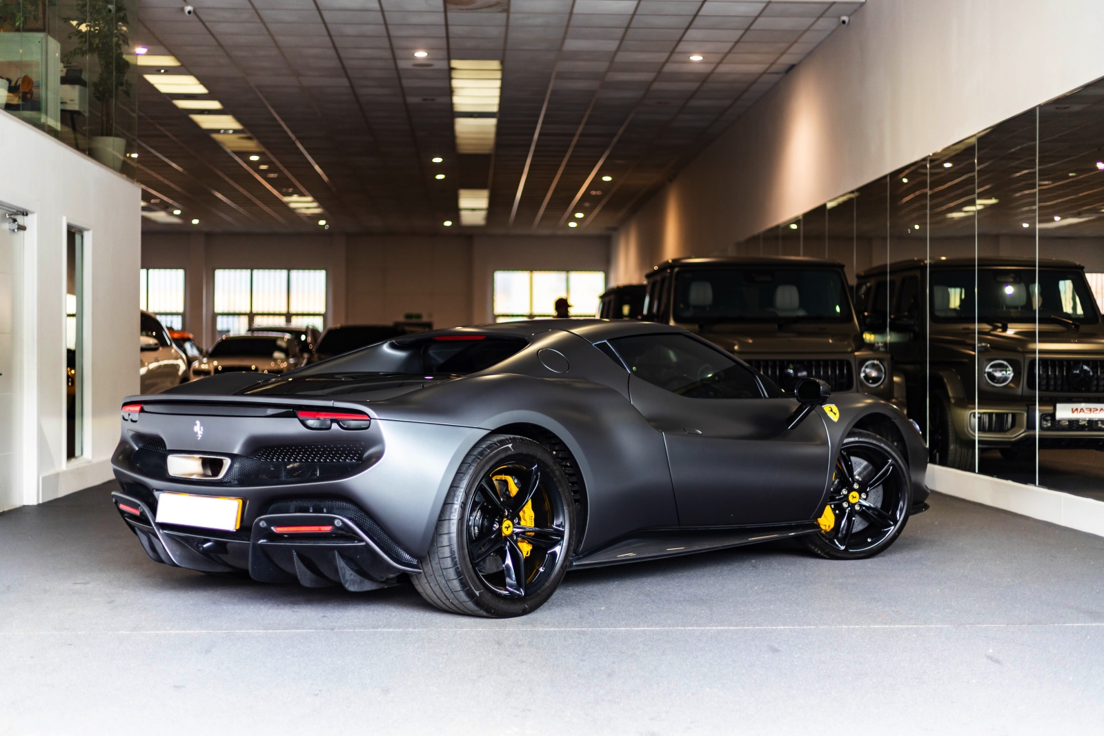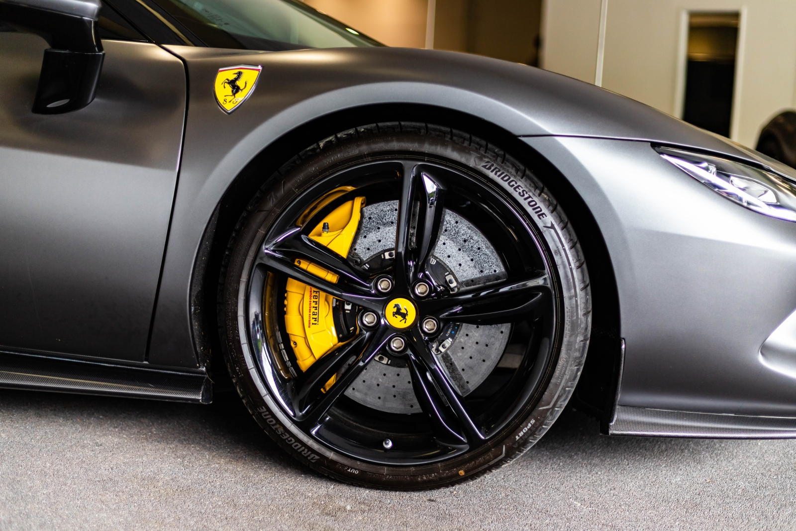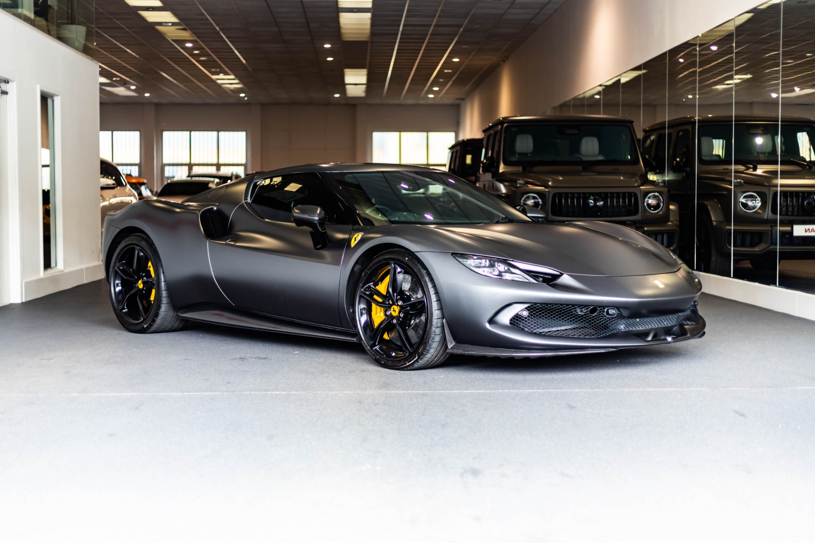 This is the Ferrari 296 GTB presented in metallic grey and complimented with a black and yellow leather interior. This is one not to be missed.