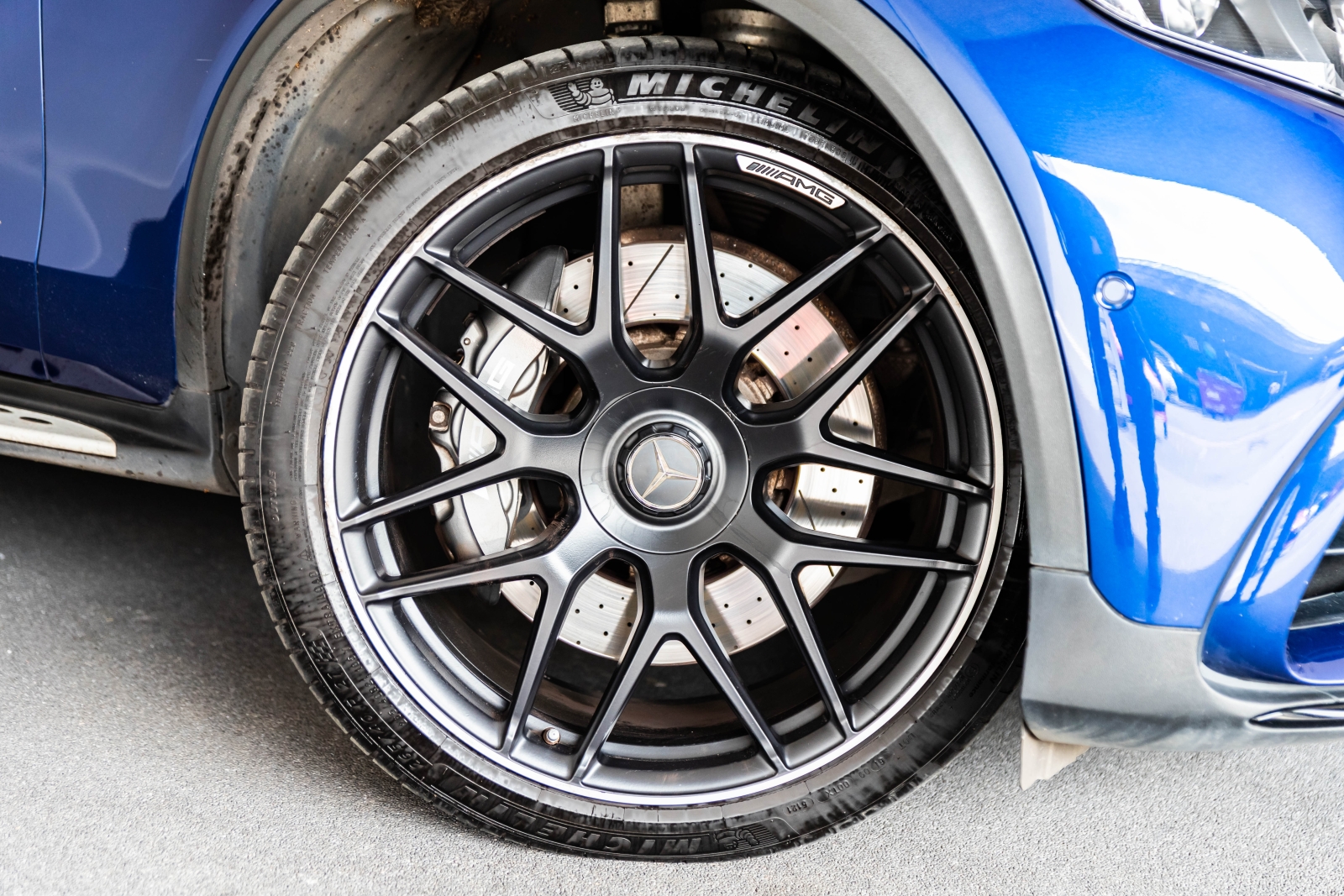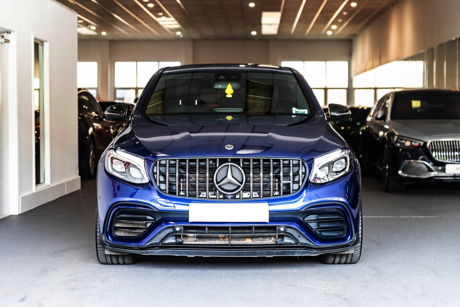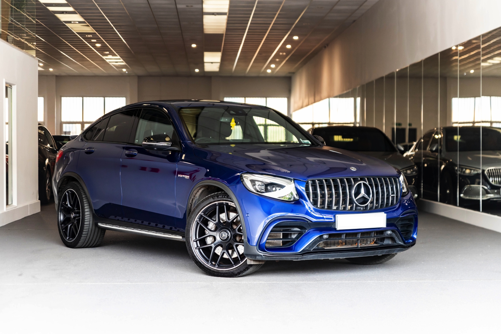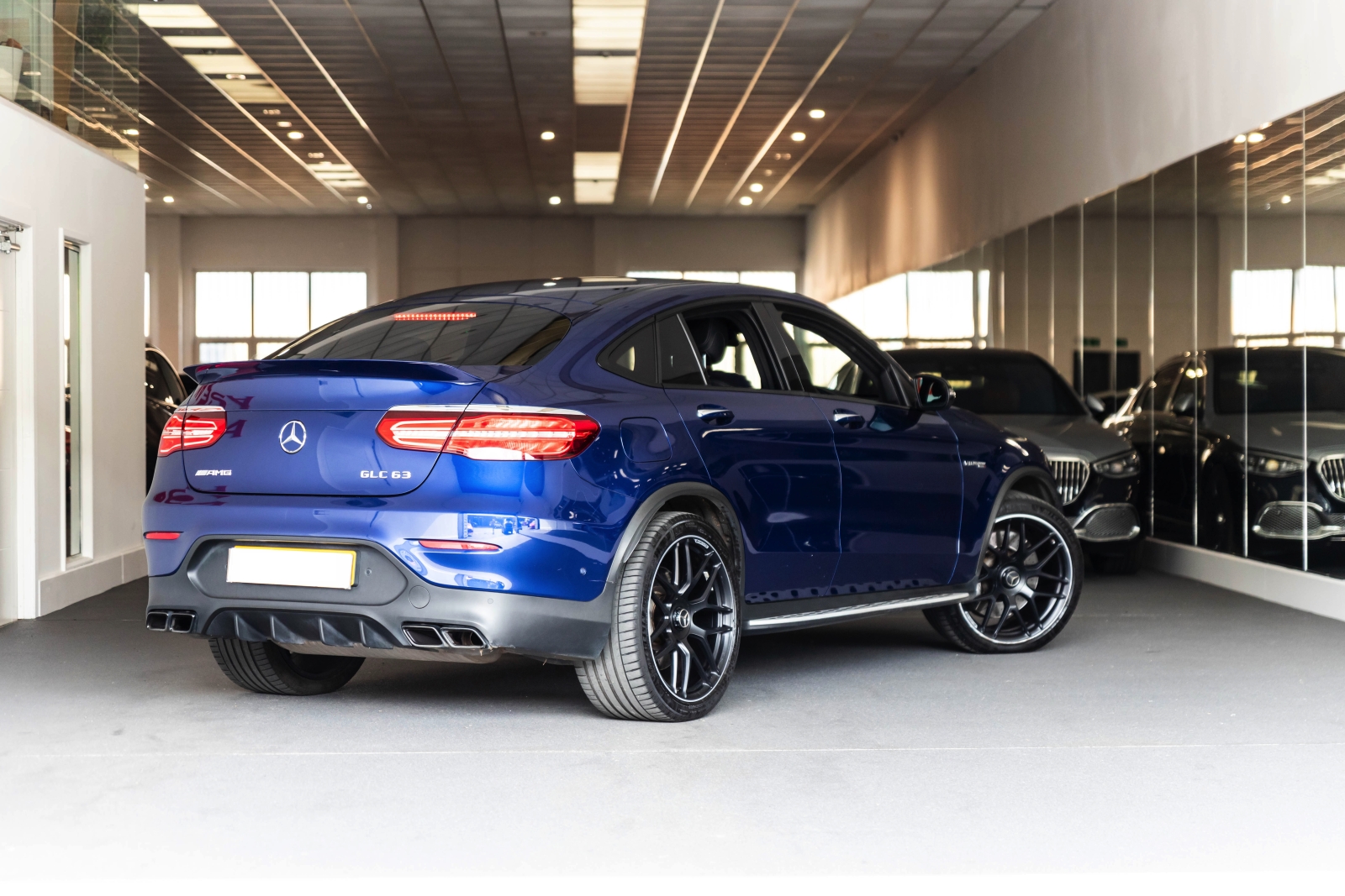 Presented in Metallic blue and complimented with a black leather interior this is the Mercedes GLC63 AMG Coupe.