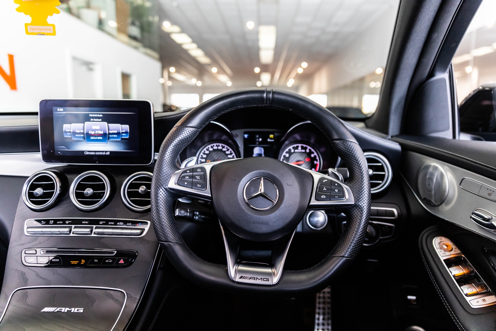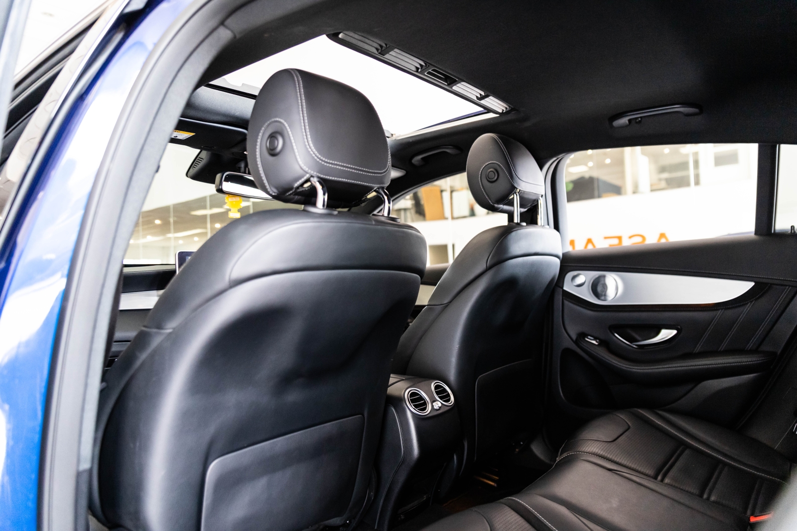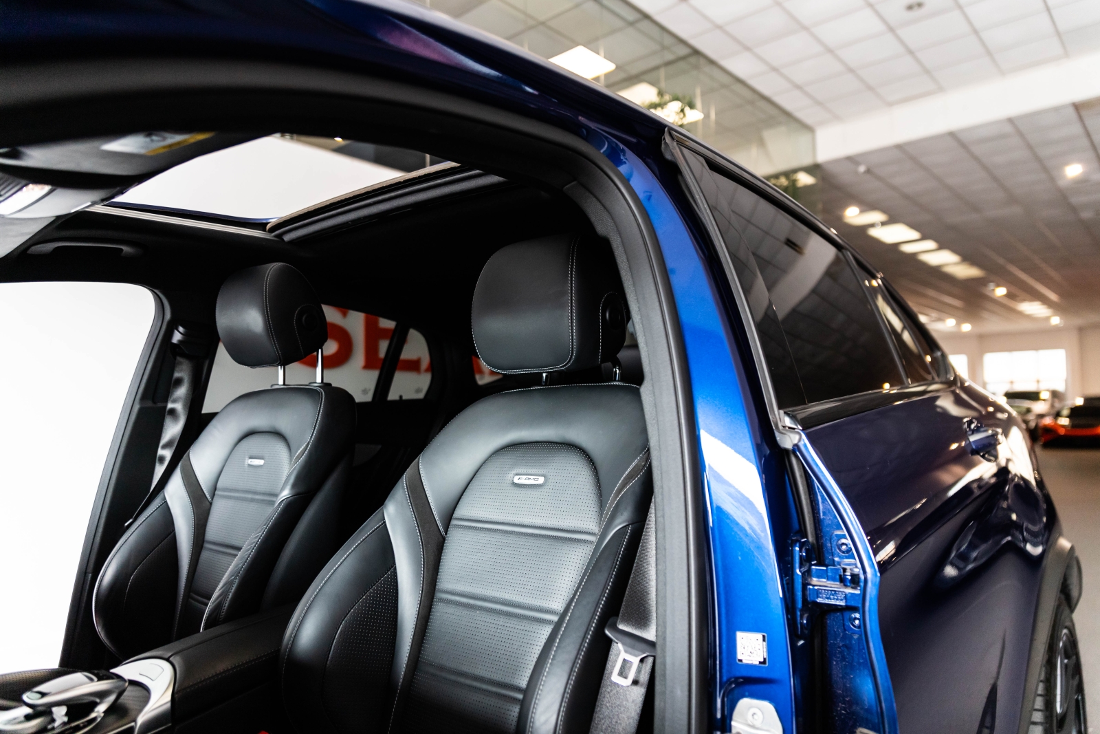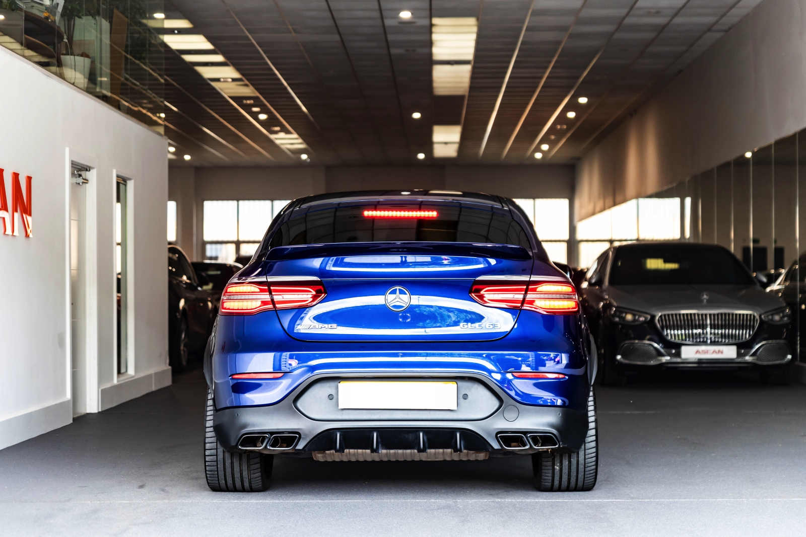 Presented in Metallic blue and complimented with a black leather interior this is the Mercedes GLC63 AMG Coupe.